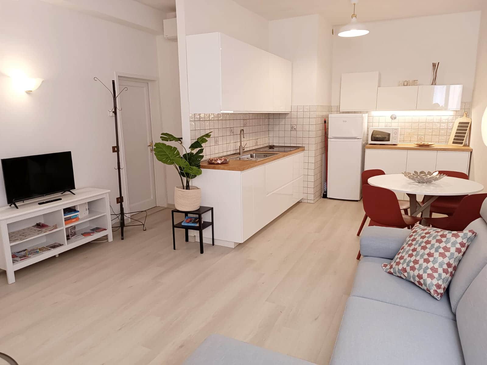 Bright and welcoming open-plan space with a sofa, TV, and dining table.