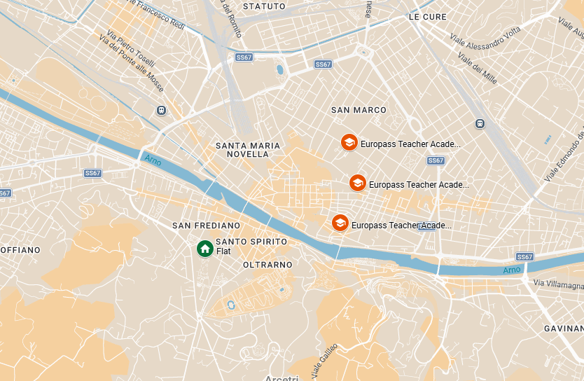 The following distances and times are calculated from the apartment to the Europass Teacher Academy locations: