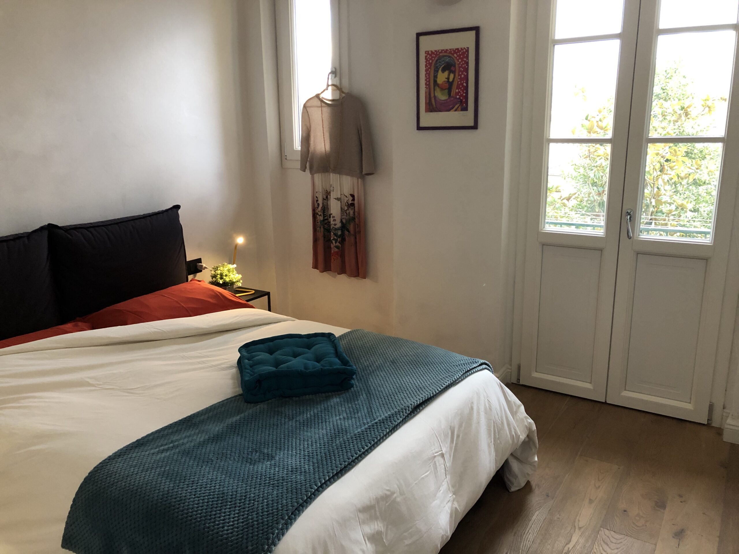 Bedroom: Features a French bed (1.40 m × 2.00 m), a large 5‑door wardrobe, two windows opening onto the balcony, and a “secret” storage room — ideal for longer stays.