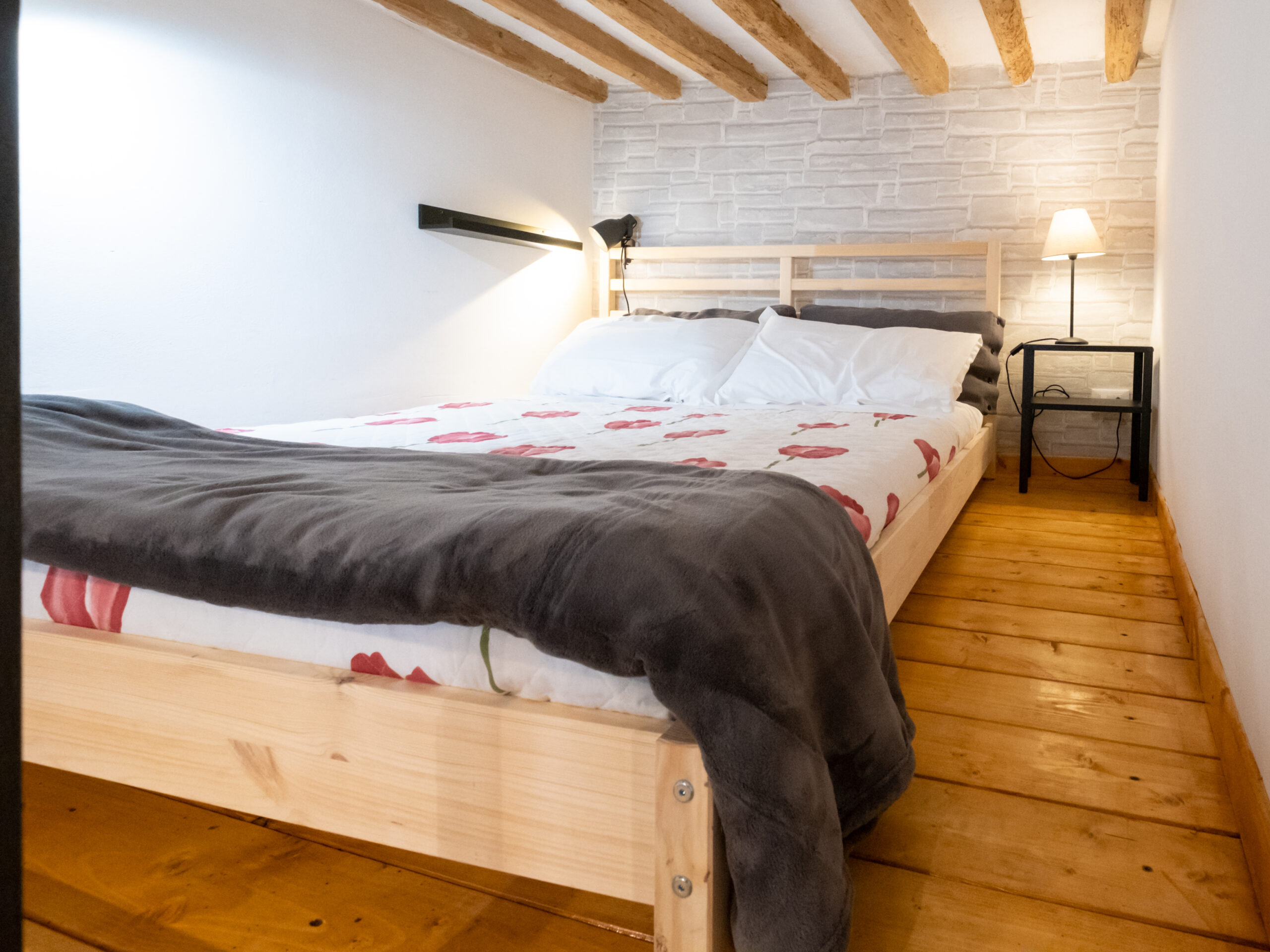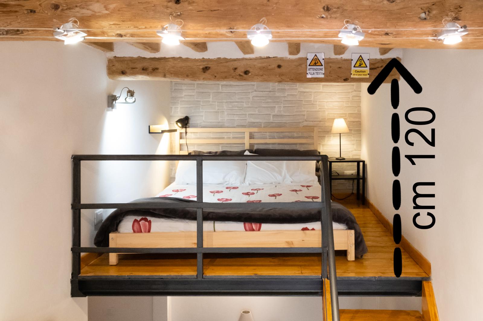 Loft Bed: Inseparable double bed (140×200 cm) with orthopedic topper, located in a cozy loft area (ceiling height 120 cm) accessible via 10 steps.
