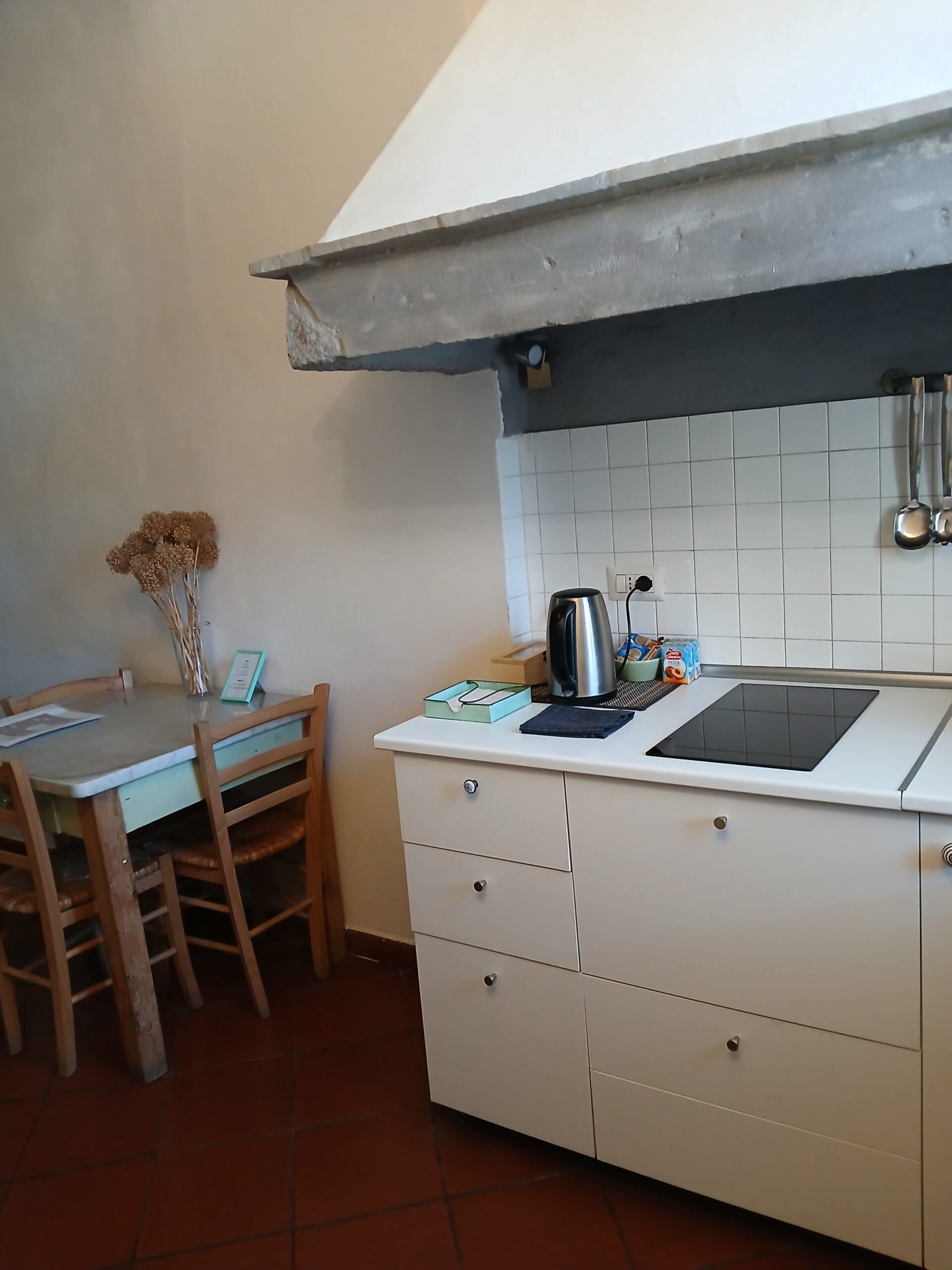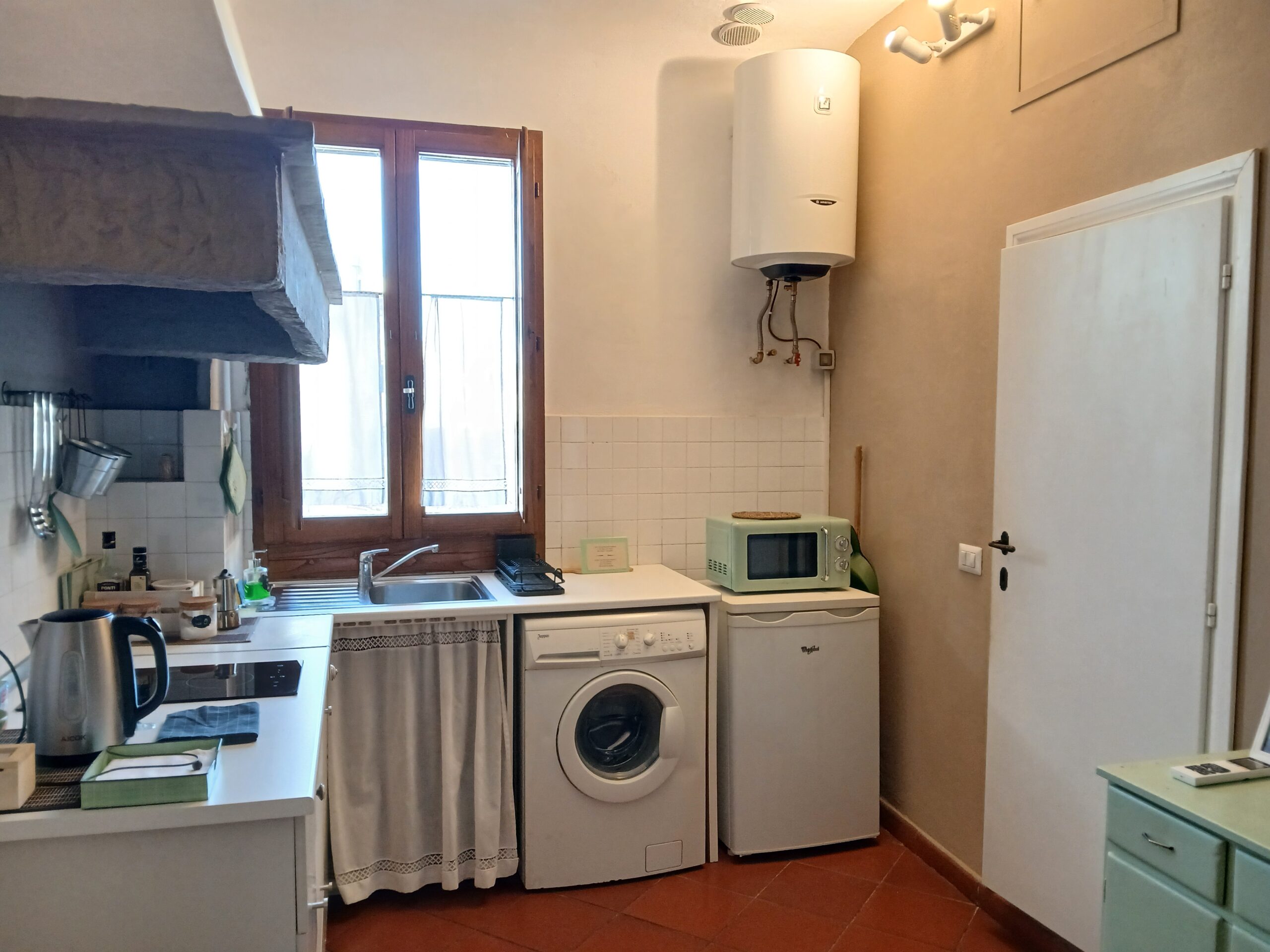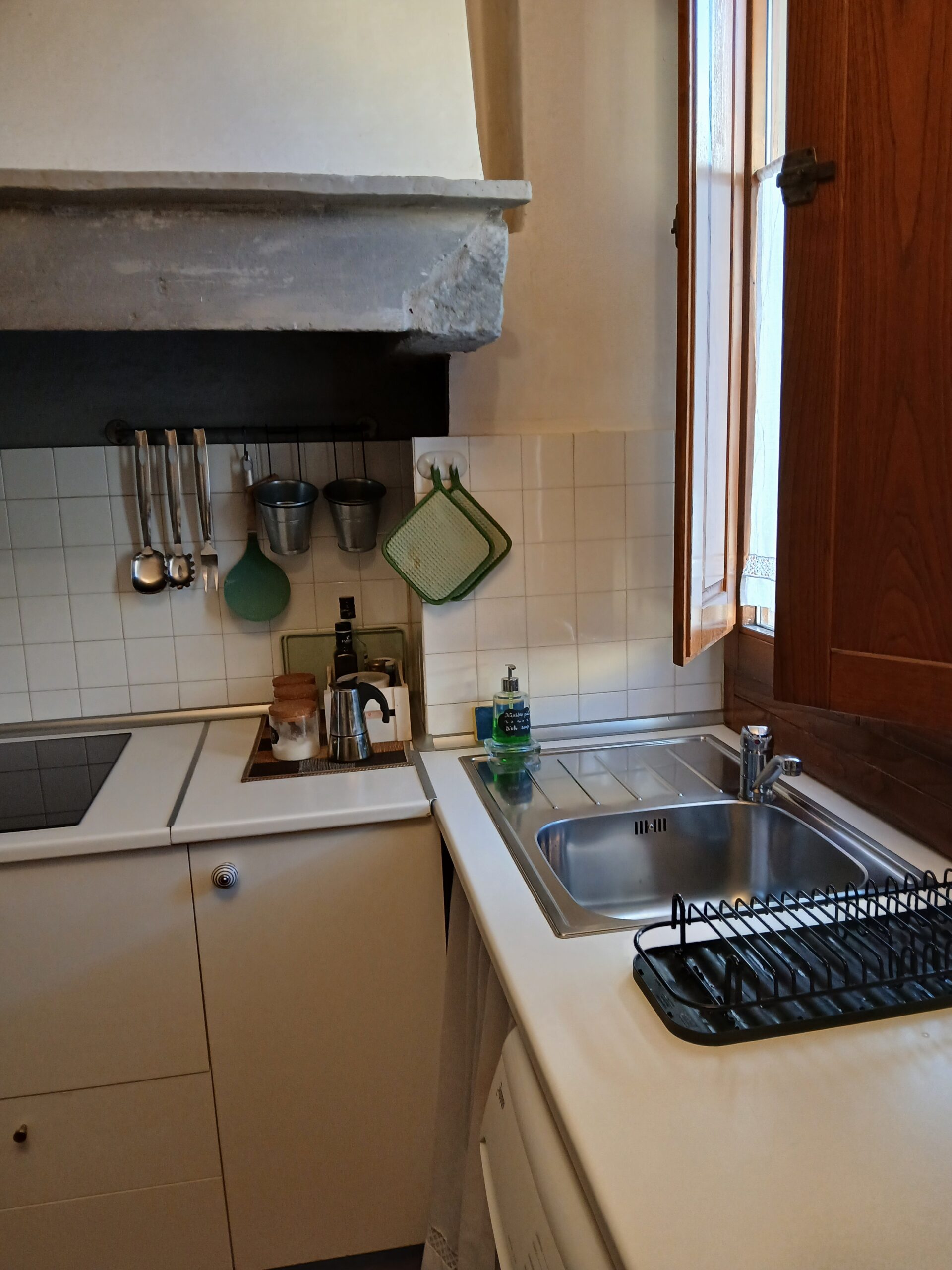- Kitchenette: Induction stovetop, microwave, refrigerator, Moka pot, basic cookware, dinnerware, salt, sugar, coffee