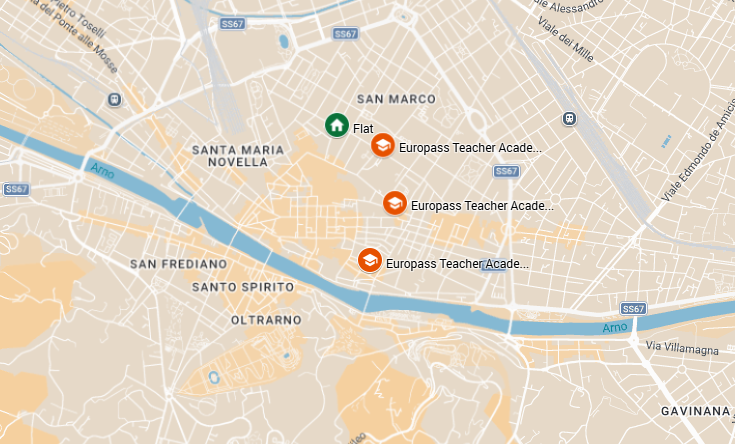 The apartment is located at Via Guelfa 14, a central and well‑connected street. Walking distances to the three course locations are:
