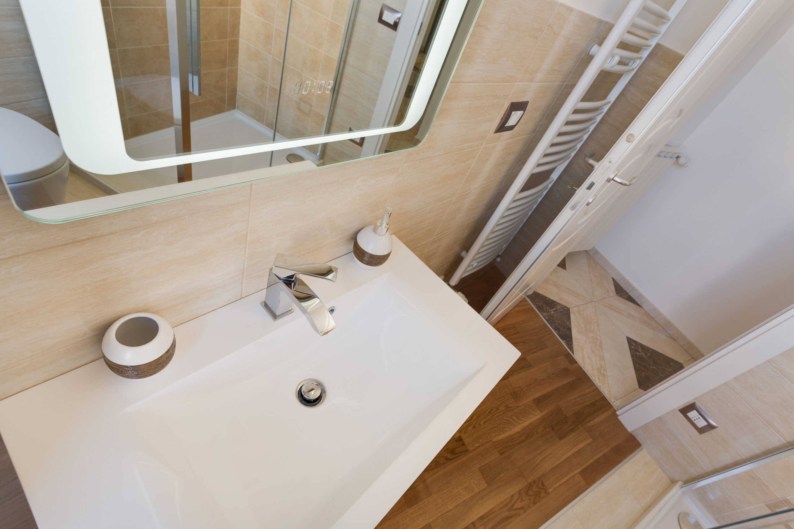 - Bathroom: Modern bathroom with a spacious shower, wooden flooring, and chromotherapy lighting for a relaxing spa‑like experience.