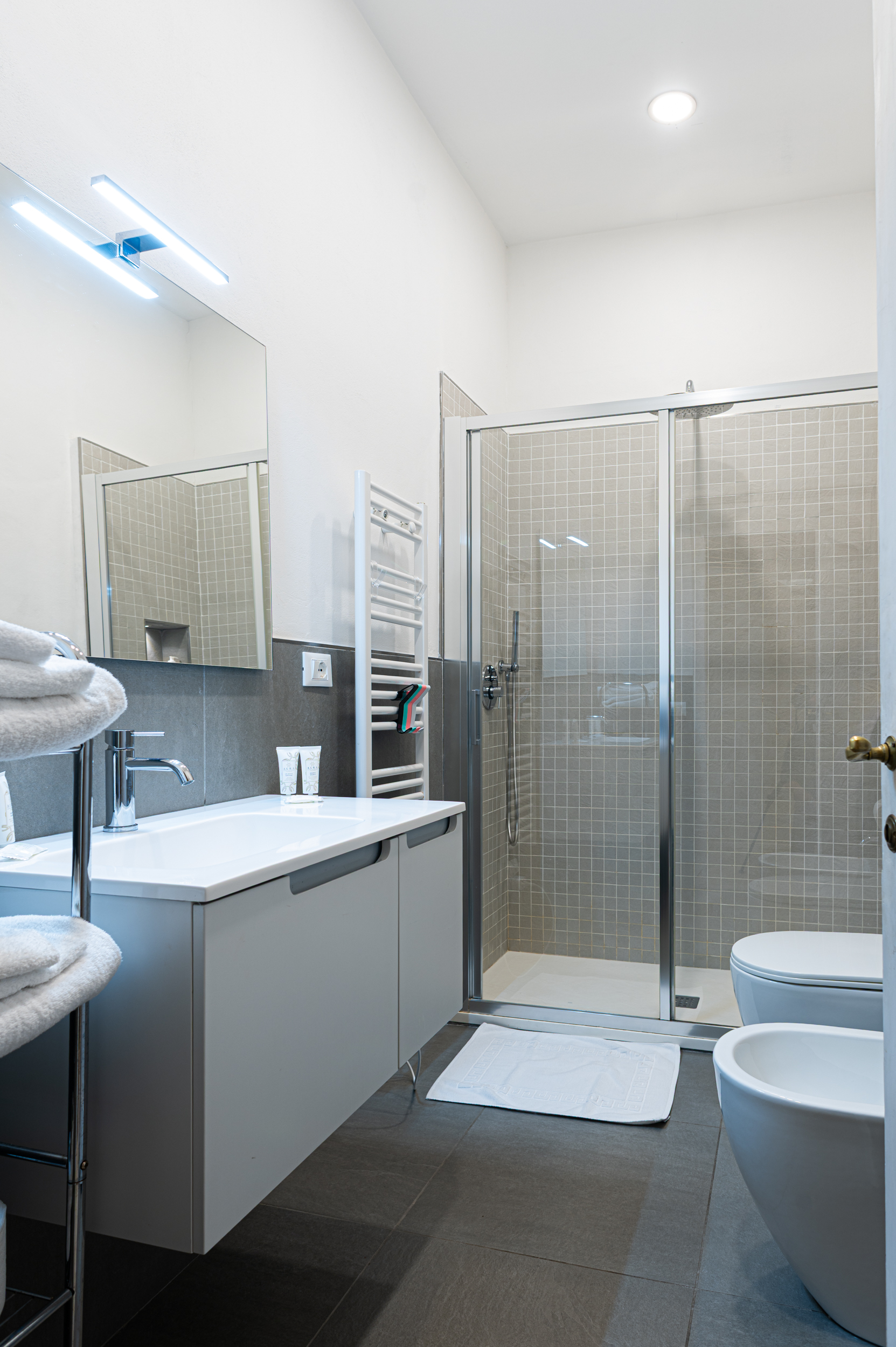 - Main bathroom with wide walk‑in shower, hairdryer, and 3 towels per guest.