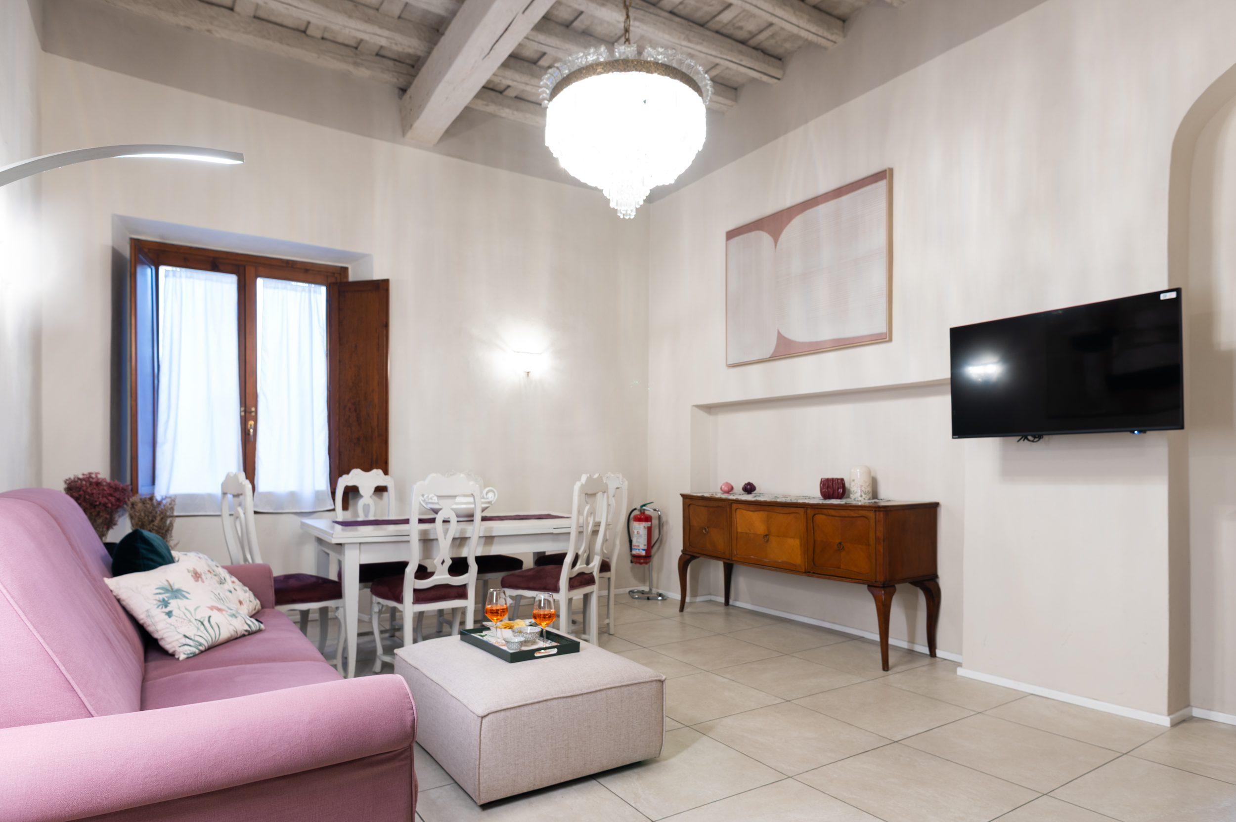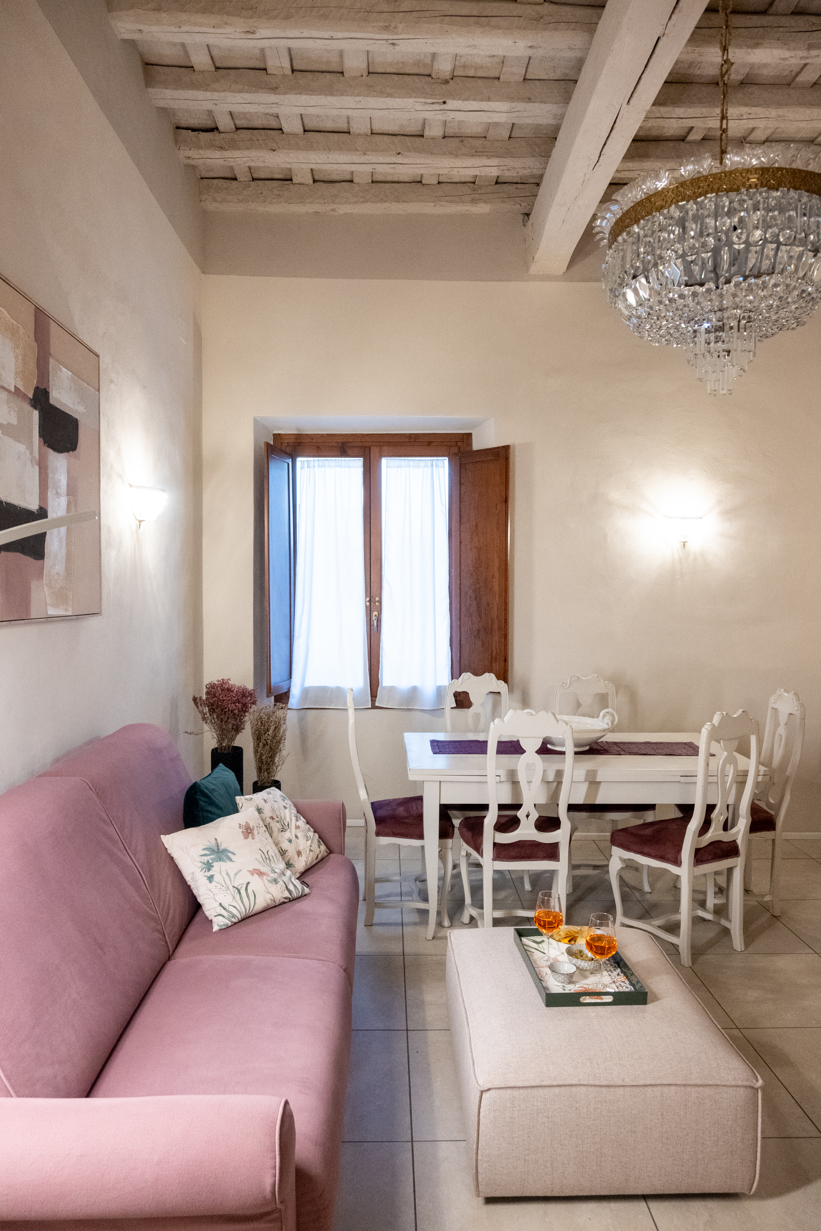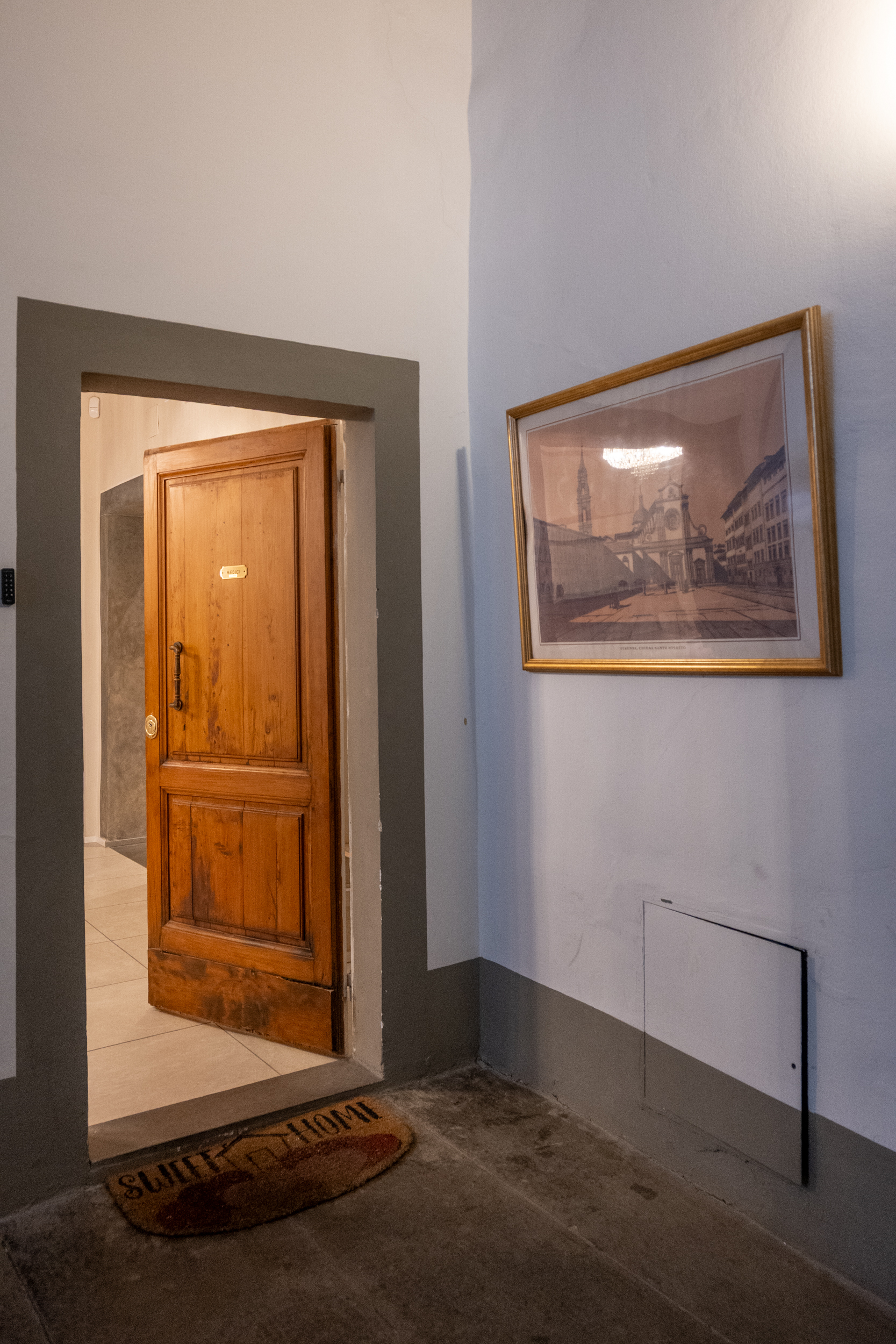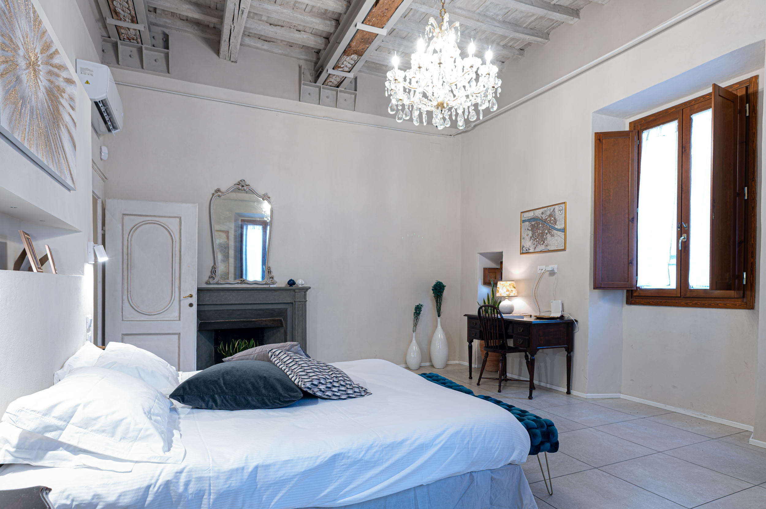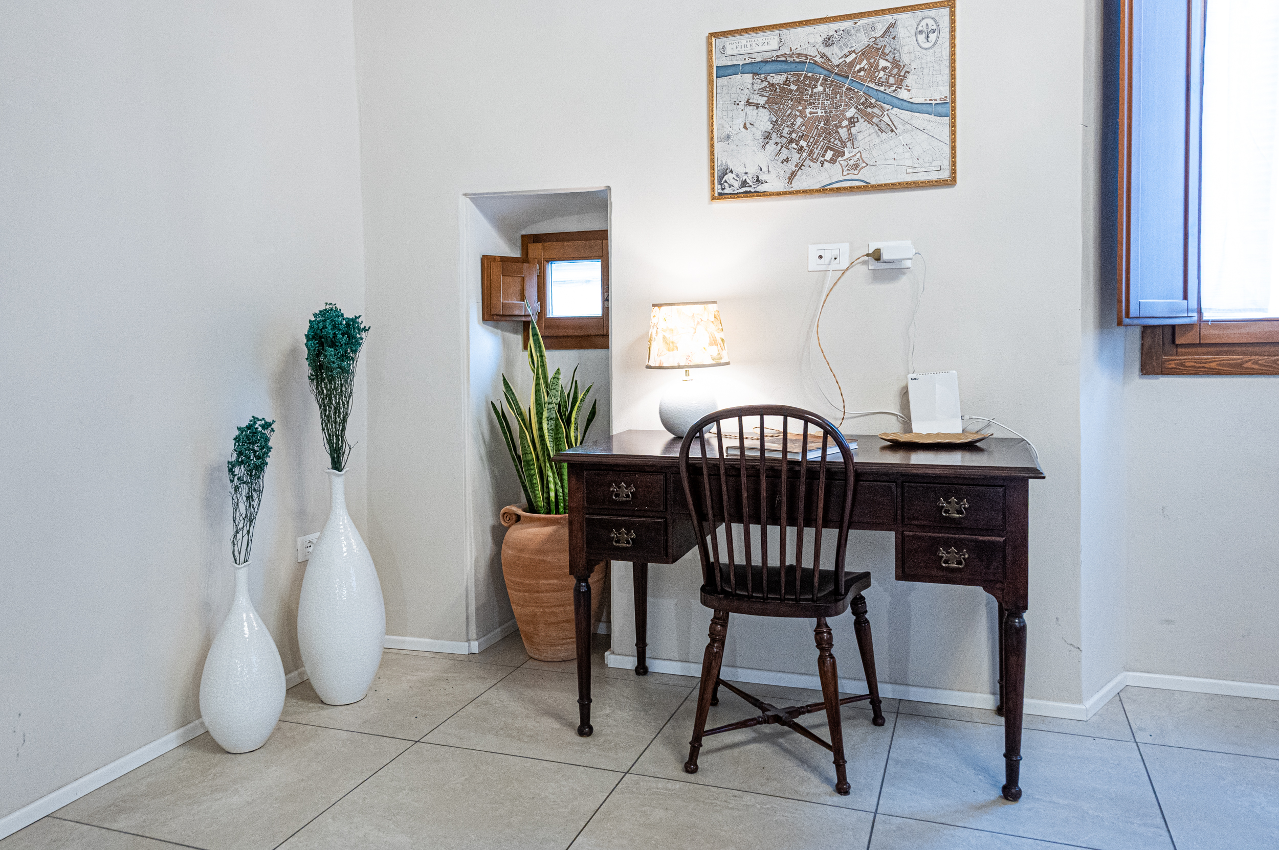 The apartment is located on the first floor (no elevator) and is accessed via wide, comfortable stairs. The interiors stand out for their generous proportions, natural light, and carefully selected handcrafted furnishings in classic Florentine style, designed to ensure relaxation, elegance, and privacy.