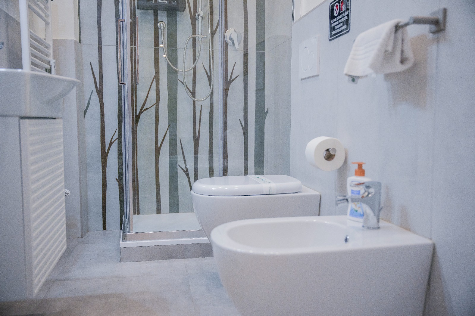 - Bathroom: Modern bathroom with shower, bidet, hand soap, shower gel, shampoo, conditioner, hair dryer, cotton towels.